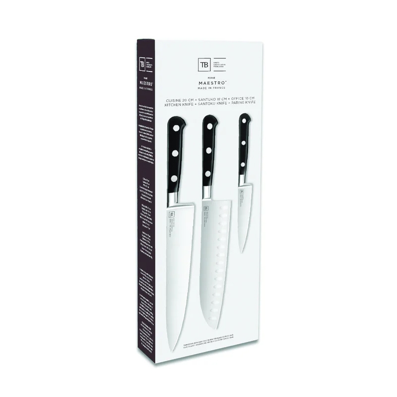 Αναβαθμίστε την κουζίνα σας με ένα κομψό σετ 3 επαγγελματικών μαχαιριών: Office 10 εκ., Santoku 18 εκ. και Chef 20 εκ. Κατασκευασμένα στο Thiers από τον καταξιωμένο οίκο Tarrerias-Bonjean, οι λεπίδες από ατσάλι NITROX της σειράς Maestro IDEAL προσφέρουν εξαιρετική κοφτερότητα και ακρίβεια σε κάθε κοπή – από χοντρό τεμαχισμό έως λεπτό ψιλό κόψιμο.