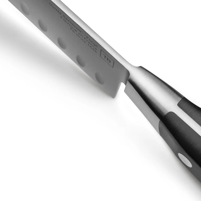 Μαχαίρι Santoku: Το κλασικό ιαπωνικό μαχαίρι για φέτες και ψιλοκόψιμο. Πολύ πλατιά λεπίδα με κυματοειδείς εσοχές για να μην κολλάει η τροφή.