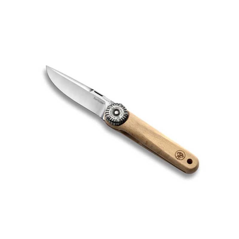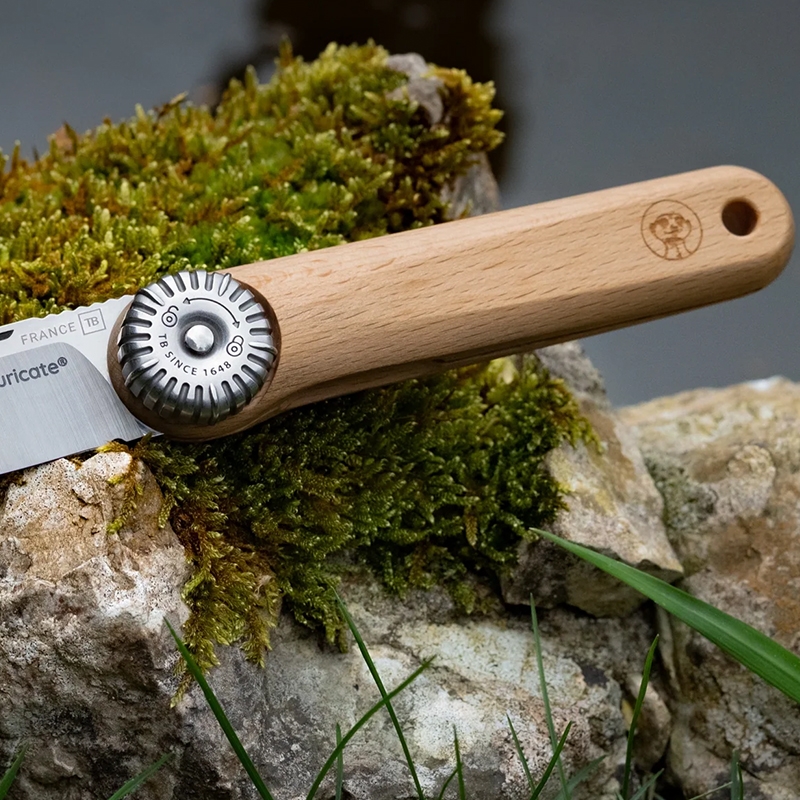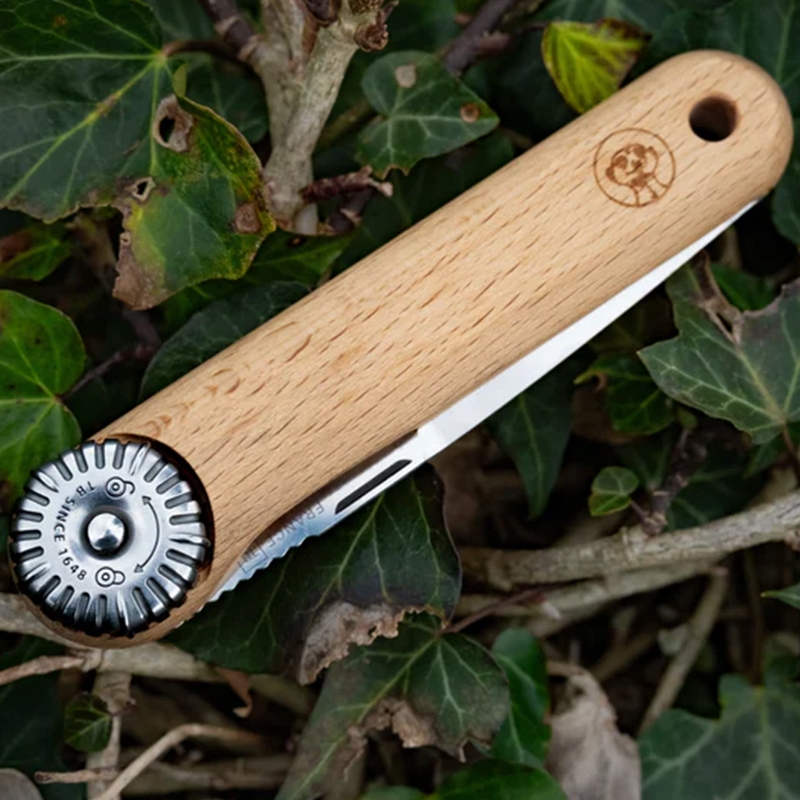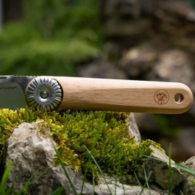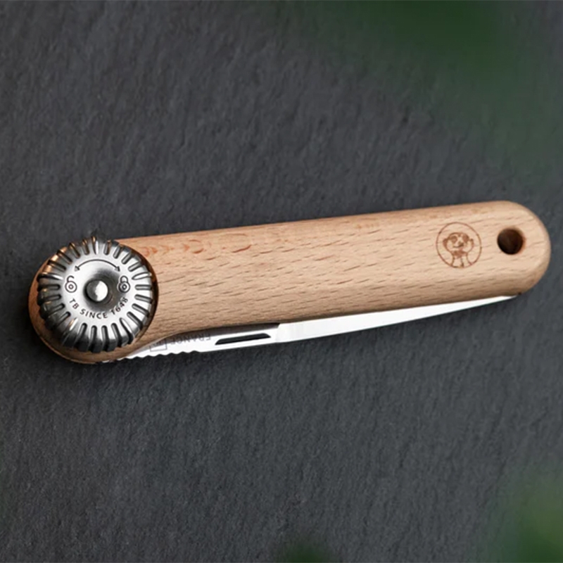 Η λεπίδα από ανοξείδωτο ατσάλι ξεδιπλώνεται ομαλά με μια κίνηση, χάρη στον εργονομικό τροχό, ενώ η λαβή από φυσικό οξιά αγκαλιάζει το χέρι σας με ζεστασιά και αυθεντικότητα.
